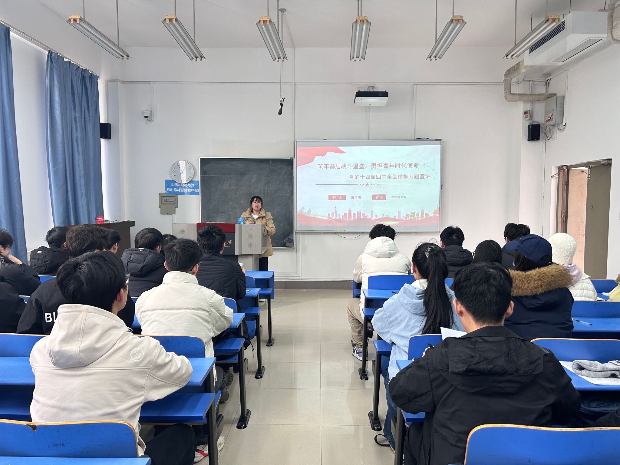 为推动党的二十届四中全会精神入脑入心,引导学生把握时代机遇、勇担发展使命,12月9日,校青年讲师团老师唐金杰在4号教学楼202教室为银河国际