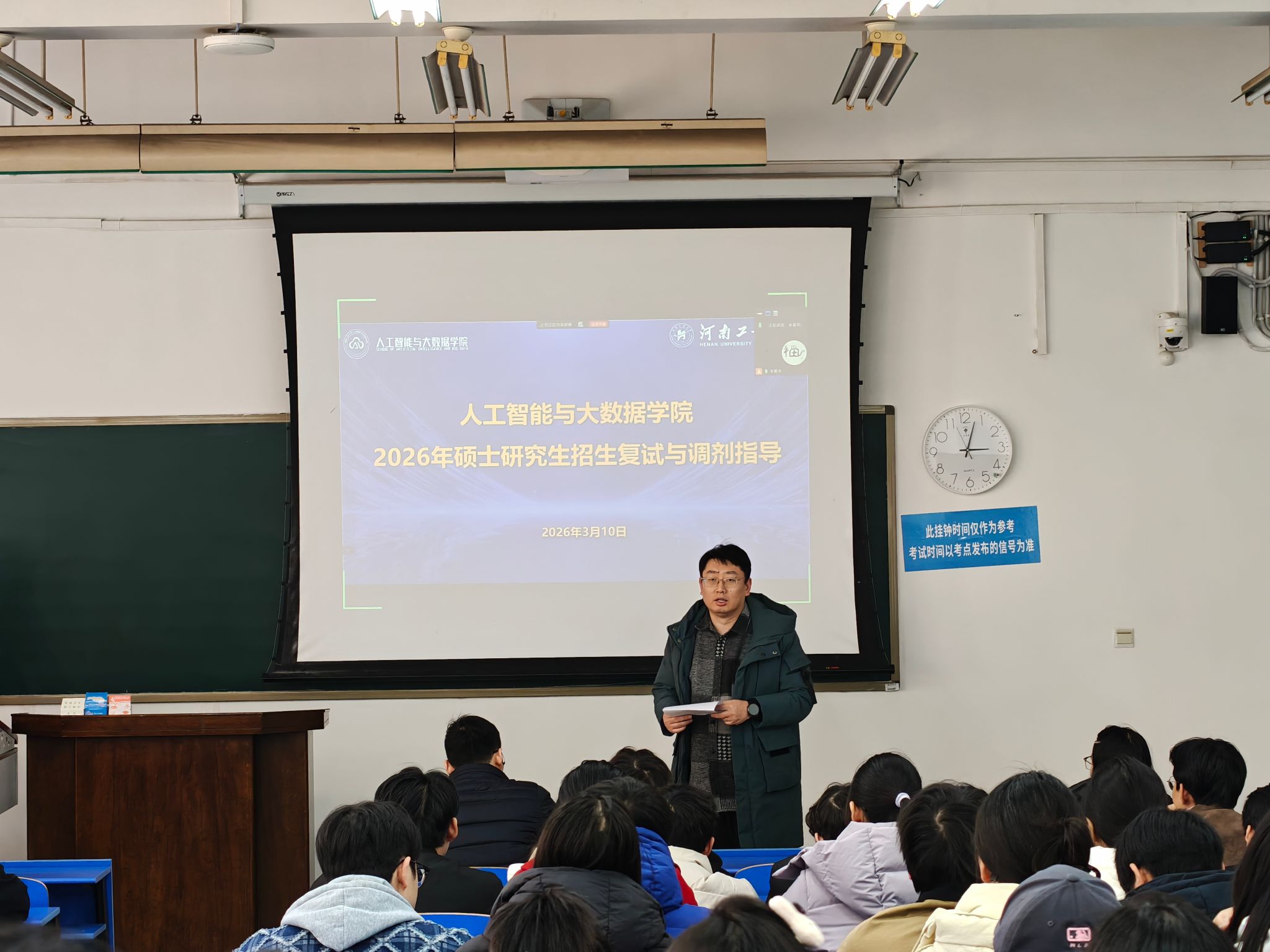 高度重视学生的升学需求,举办此次交流会旨在搭建精准指导平台,帮助同学们掌握复试技巧、了解调剂政策,从而增强信心、科学应对。他简要介绍了朱春华在学科建设、人才培养以及考研指导方面的丰富经验与专业成果,希望同学们认真聆听、积极交流,切实把握本次学习机会,为复试与调剂做好充分准备。