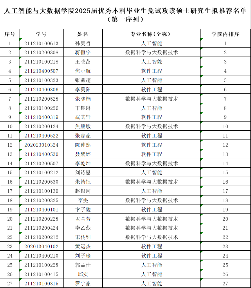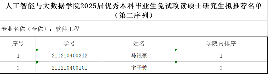 推免工作领导小组研究审核,确定软件工程、人工智能、数据科学与大数据技术3个专业拟推荐名单如下,现予以公示。