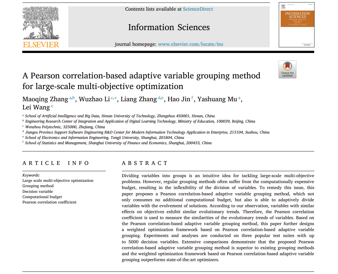 复杂图像处理与理解团队成员张茂清博士在国际高水平学术期刊Information Sciences(中科院一区Top, IF=8.1)上发表了题为“A Pearson correlation-based adaptive variable grouping method for large-scale multi-objective optimization”(DOI: 10.1016/j.ins.2023.02.055)的研究论文,该成果是解决大规模多目标优化问题的阶段性成果,银河国际