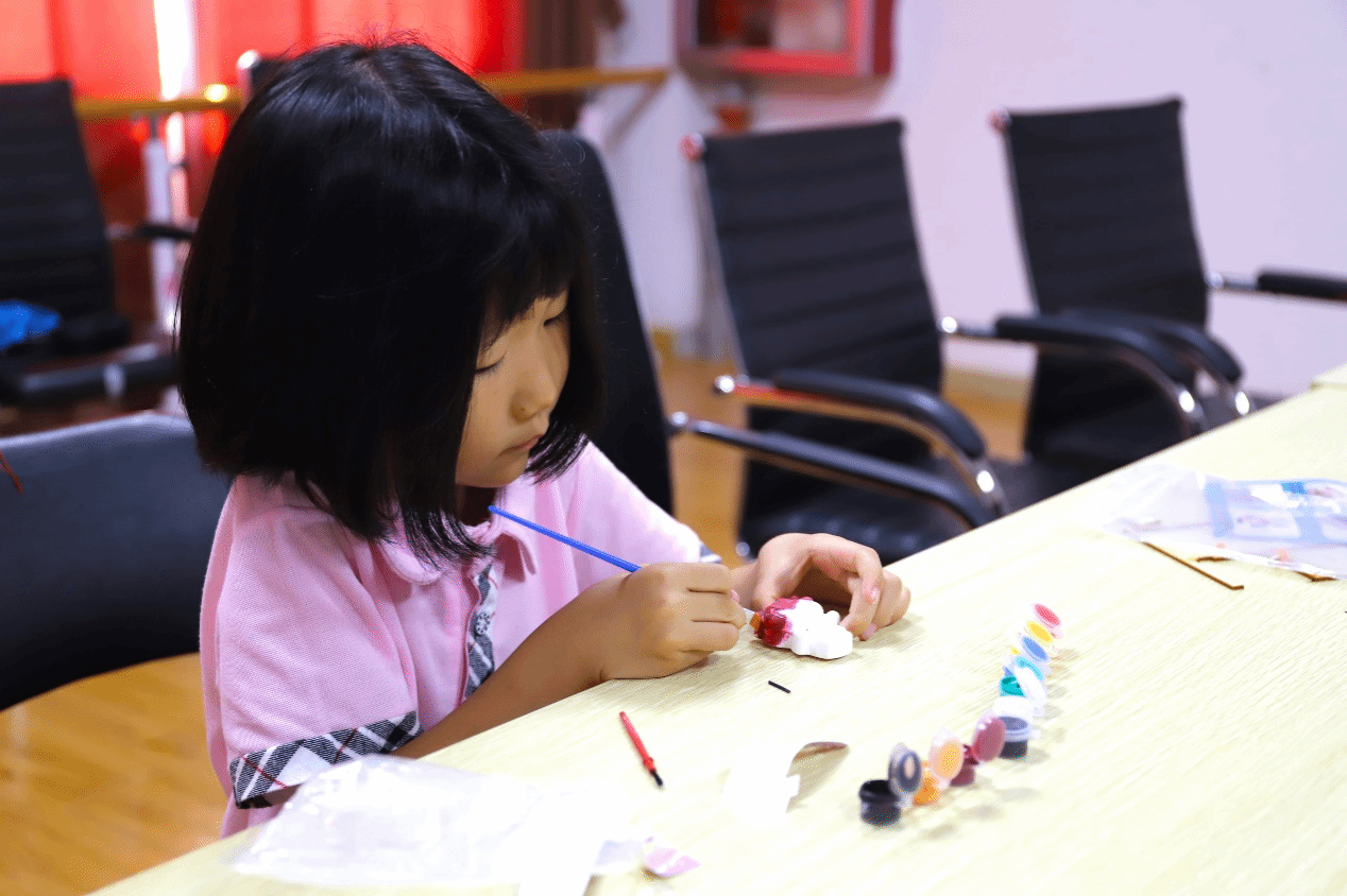 活动现场,五彩缤纷的颜料铺展开来,小朋友们挥洒着手中的画笔,发挥他们对每一份石膏卡通娃娃的理解和想象,描绘出色彩斑斓的画面。每一笔、每一划都透露出孩子们对他们心中的纯洁与美好。