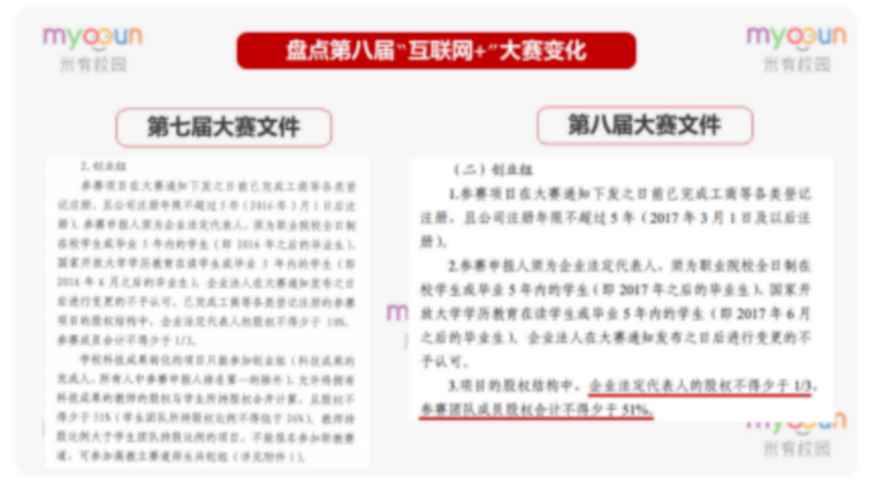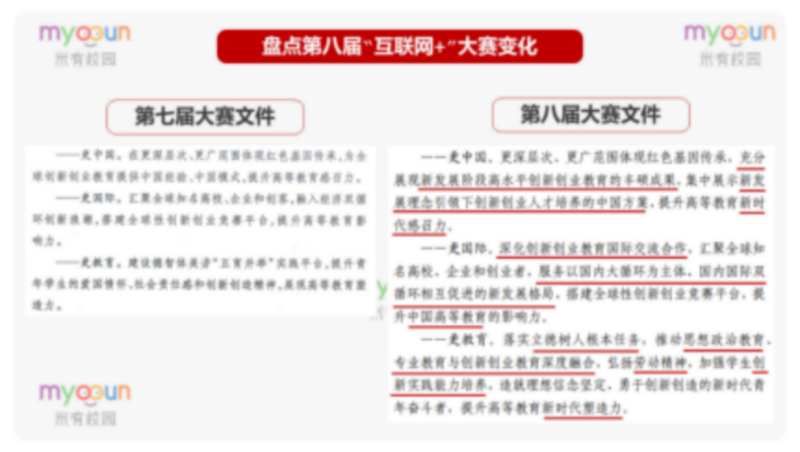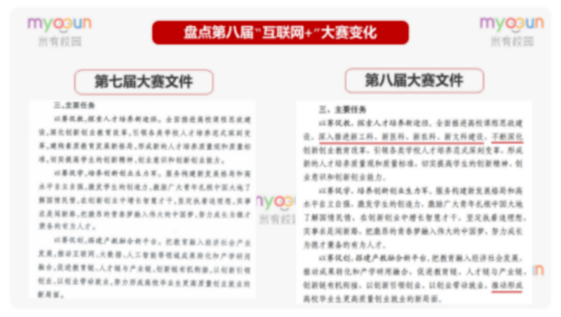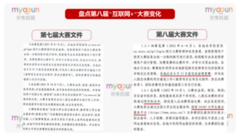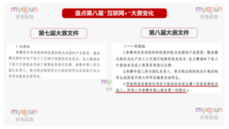 以下内容结合米有校园专家团(往届省/国赛专家)意见,整理了第八届“互联网+”大赛的63处变化合集,现全部分享给大家,建议大家收藏好,方便备赛中随时可查!