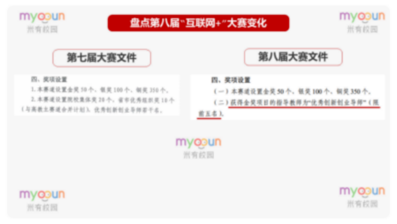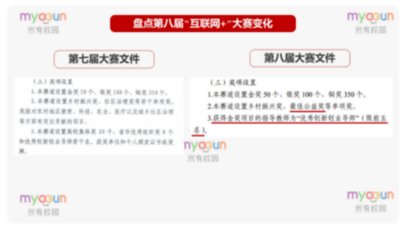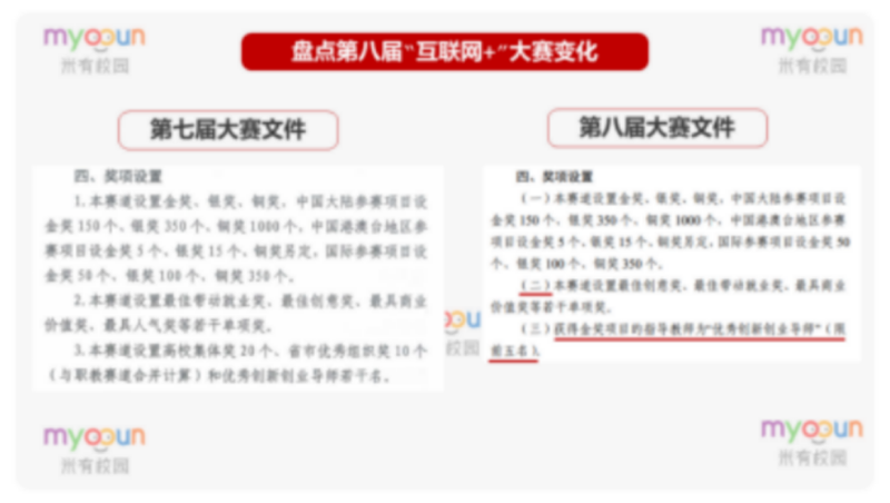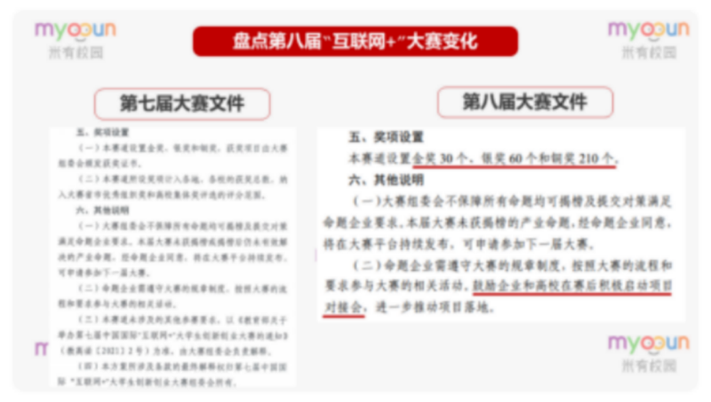 →金奖增至30个,银奖增至60个,铜奖增至210个;以上内容仅为第八届大赛的主要变化,米有校园通过逐字对比两届大赛通知文件,发现还有很多值得各高校师生关注的大赛变化,对大家备赛有重要参考价值。