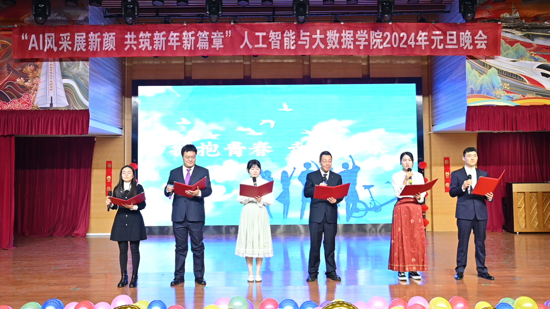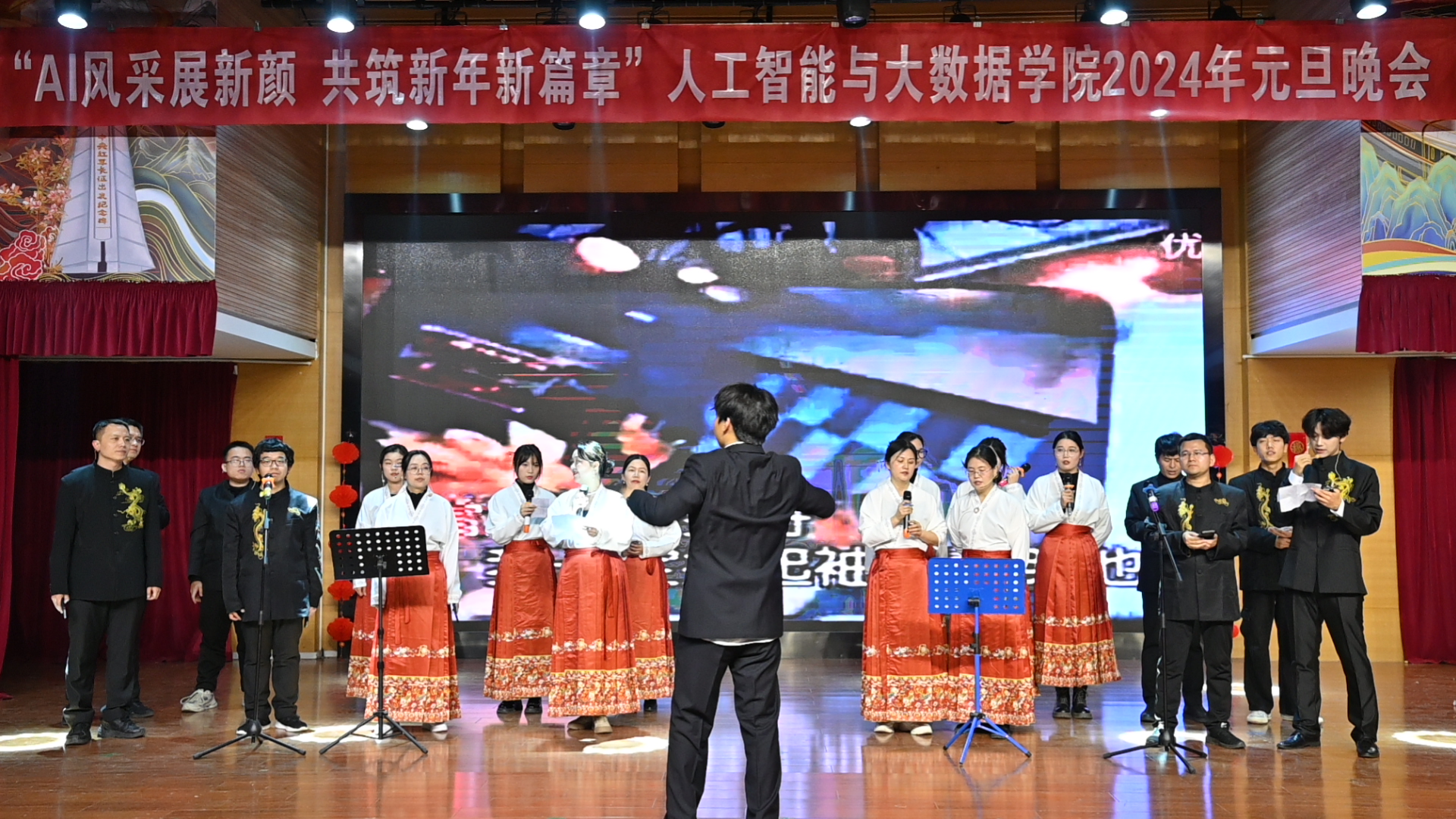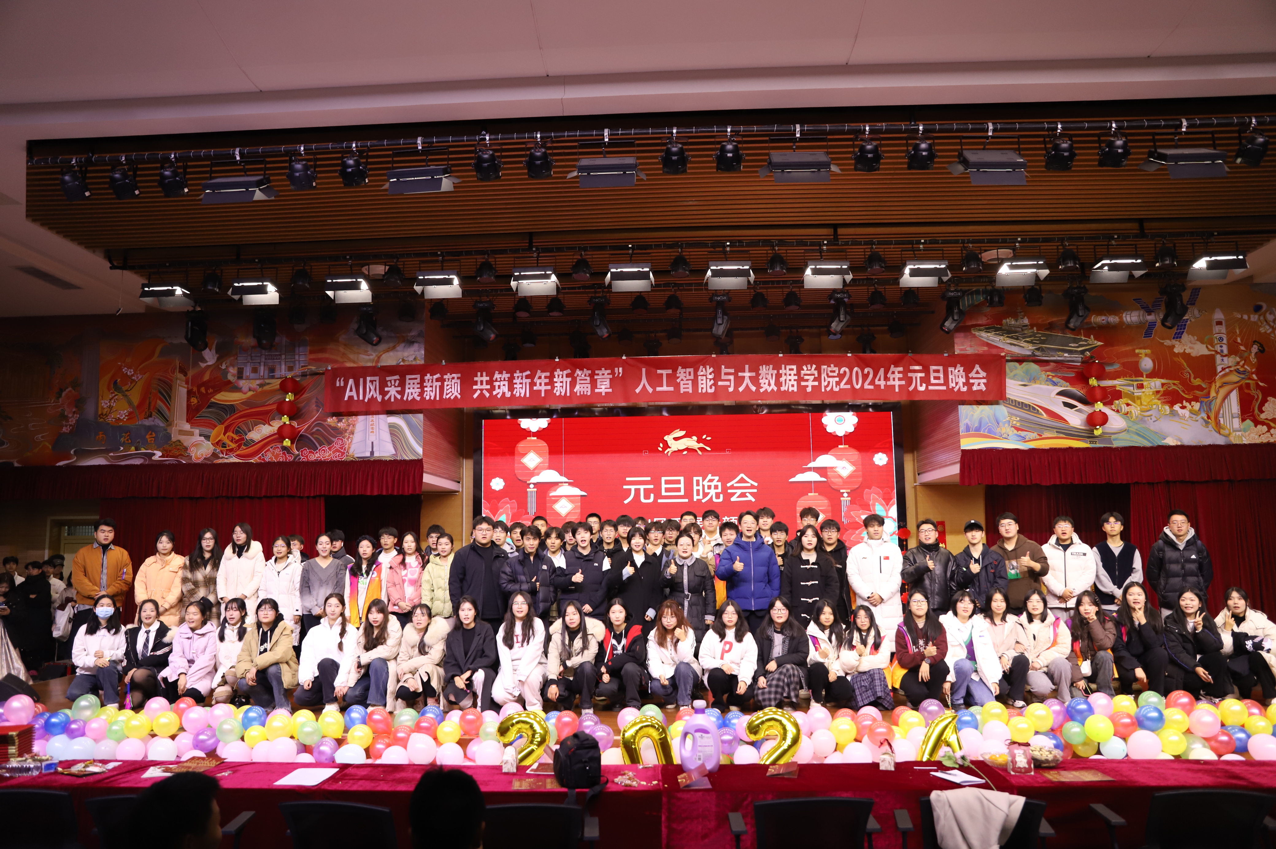 举办了 “AI风采展新颜,共筑新年新篇章” 2024年师生新年联欢会。校党委学生工作部副部长薛中海、校团委副书记吴鹏、银河国际