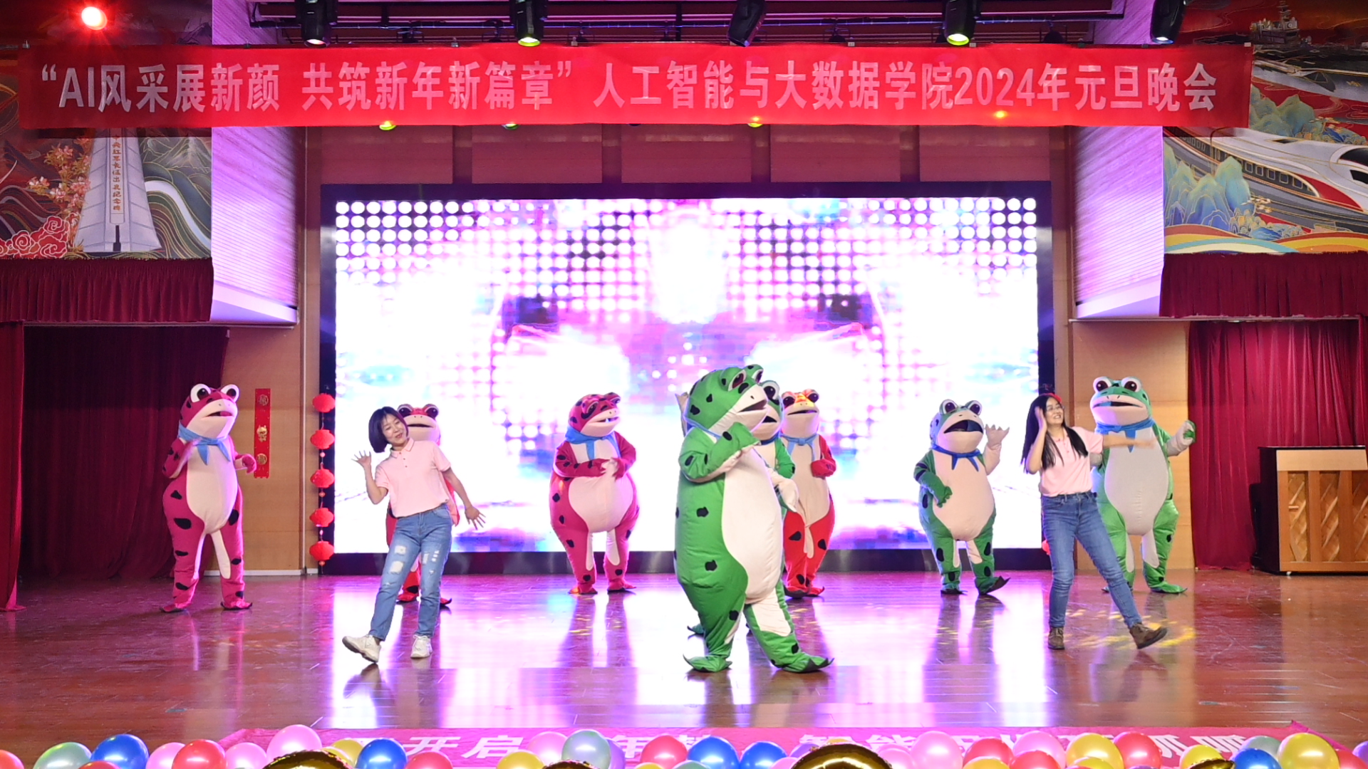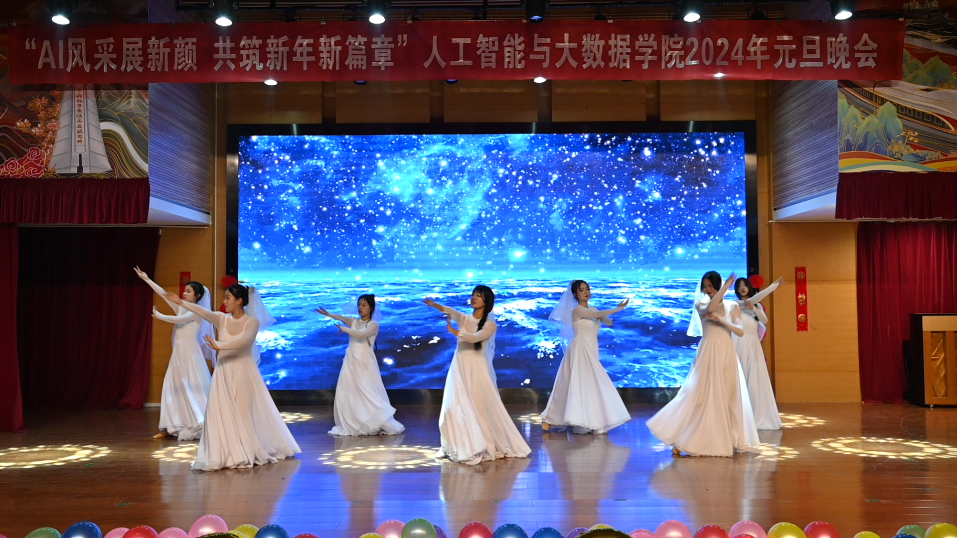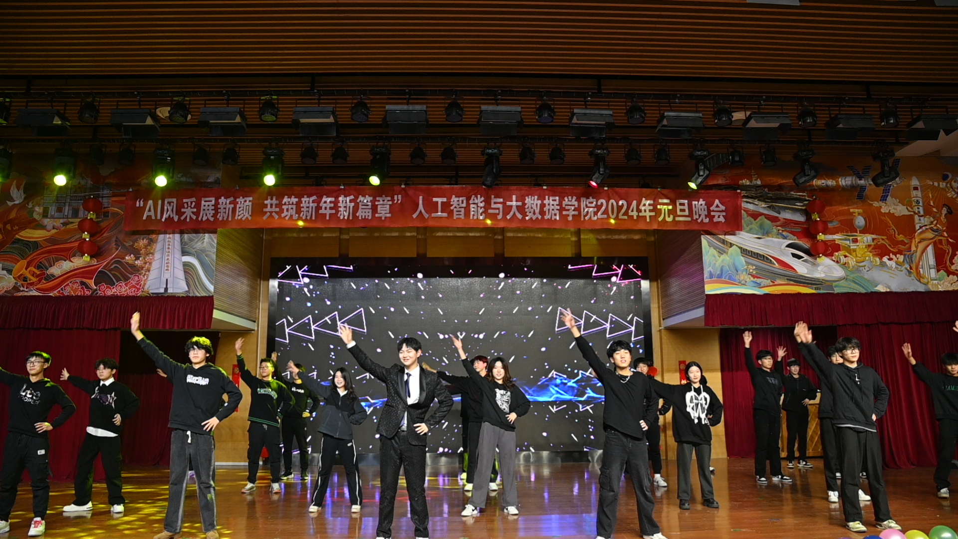 举办了 “AI风采展新颜,共筑新年新篇章” 2024年师生新年联欢会。校党委学生工作部副部长薛中海、校团委副书记吴鹏、银河国际