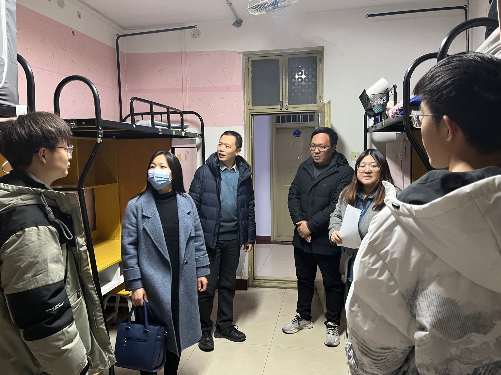 走访中,杜鹏亲切询问了同学们的假期生活以及返校交通方式,鼓励同学们在新学期力争上游,继续追逐远大理想,争做有责任有担当的新时代大学生。樊超提醒同学们要快速调整新学期状态,投身到学习中去,在学业中有困难的地方要积极和任课老师以及班主任、辅导员沟通交流。薛运侠对同学们返校表达了热情的欢迎,反复叮嘱同学们要增强安全防范意识,保持通风,加强疾病预防,合理安排时间,认真学习,积极参加实践活动,营造积极健康的宿舍文化氛围,加强身体锻炼,为今后的学习和工作打下坚实的基础。赵玉娟勉励同学们要坚定信心,努力学习,多阅读、善思考,在专业功课上多下功夫,通过自我约束、自我管理,争做品学兼优之人。