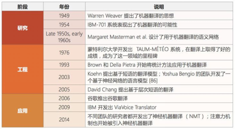 机器翻译是利用机器的力量自动将一种自然语言(源语言)的文本翻译成另一种语言(目标语言)。机器翻译是一个见证了大量发展历程的应用领域。该领域最近由于神经机器翻译而取得了非常显著的进展,但仍然没有全面达到专业译者的水平;但是,我们相信在大数据、云计算和深度学习技术的帮助下,机器翻译很快就将进入社会影响阶段。发展历程如下: